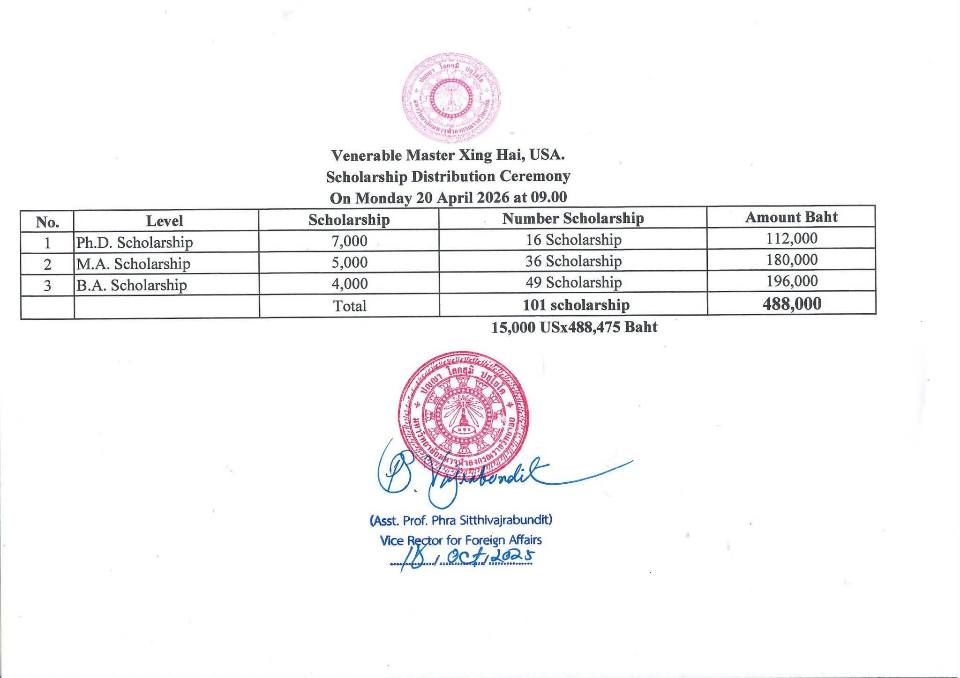พระธรรมาจารย์ซิงไห่ ผู้ก่อตั้งและผู้อำนวยการฝ่ายจิตวิญญาณแห่ง Medicine Buddha Meditation Group, ประเทศสหรัฐอเมริกา เป็นกัลยาณมิตรของพระสิทธิวัชรบัณฑิต มีความเคารพนับถือกันเป็นการส่วนตัวมาช้านาน แจ้งความประสงค์เป็นเจ้าภาพถวายทุนการศึกษาแก่นิสิต มจร ๑๐๑ ทุน จำนวน USD 15,000 หรือประมาณ ๔๘๘,๔๗๕ บาท (สี่แสนแปดหมื่นแปดพันสี่ร้อยเจ็ดสิบห้าบาทถ้วน) ในวันจันทร์ที่ ๒๐ เมษายน ๒๕๖๙ ณ หอประชุม มวก ๔๘ พรรษา มจร พระนครศรีอยุธยา