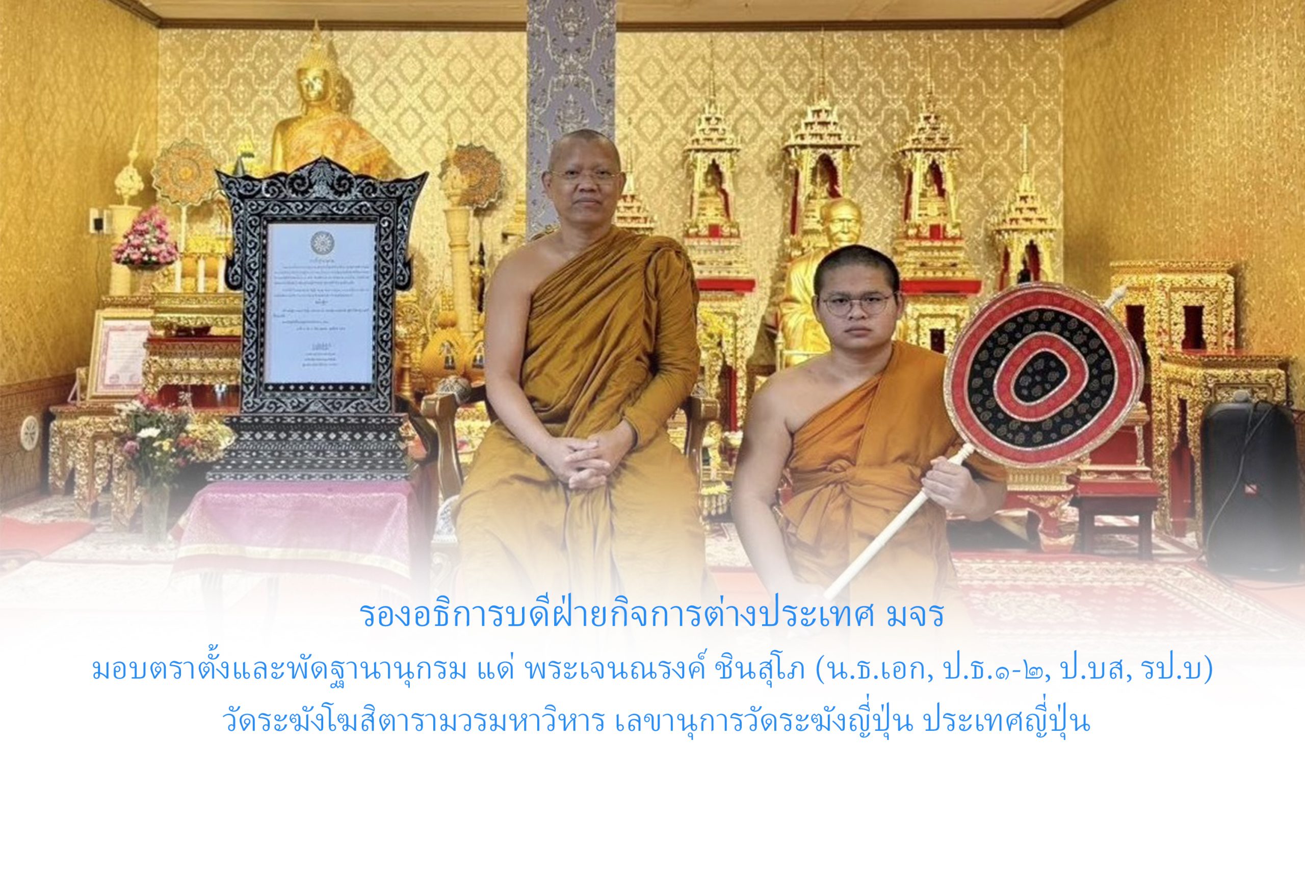 วันอาทิตย์ที่ ๒๖ ตุลาคม พ.ศ.๒๕๖๘ เวลา ๑๔.๒๙ น. พระสิทธิวัชรบัณฑิต ผู้ช่วยเจ้าอาวาสวัดราชสิทธารามราชวรวิหาร รองอธิการบดีฝ่ายกิจการต่างประเทศ มจร มอบตราตั้งและพัดฐาฐานานุกรม แด่ พระเจนณรงค์ ชินสุโภ (น.ธ.เอก, ป.ธ.๑-๒, ป.บส, รป.บ) พระธรรมทูตทูตสายต่างประเทศ รุ่นที่ ๓๐ วัดระฆังโฆสิตารามวรมหาวิหาร เลขานุการวัดระฆังญี่ปุ่น ณ ภายในอุโบสถวัดระฆังญี่ปุ่น เมืองคานากาวา มหานครโตเกียว ประเทศญี่ปุ่น