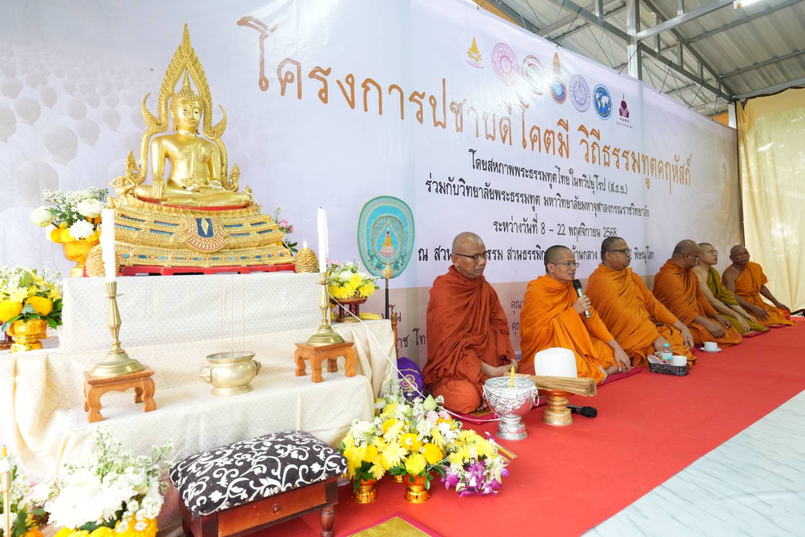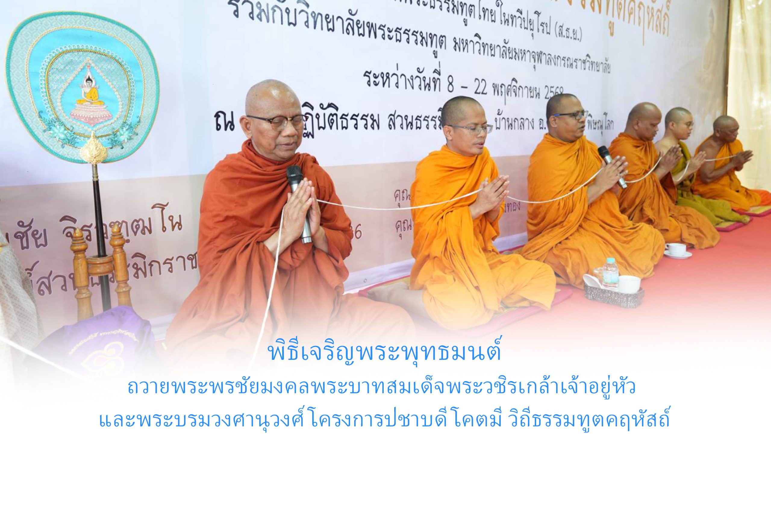 วันเสาร์ที่ ๘ พฤศจิกายน พ.ศ. ๒๕๖๘ เวลา ๑๕.๐๐ น. พระเดชพระคุณพระสิทธิวัชรบัณฑิต รองอธิการบดีฝ่ายกิจการต่างประเทศ มจร ได้มอบหมายให้พระครูสุตรัตนบัณฑิต ผู้อำนวยการวิทยาลัยพระธรรมทูต นำคณะผู้บริหาร คณาจารย์ และเจ้าหน้าที่วิทยาลัยพระธรรมทูต และกองวิเทศสัมพันธ์ ร่วมดำเนินงานโครงการปชาบดีโคตมี วิถีธรรมทูตคฤหัสถ์” โดยโครงการกำหนดให้มีพิธีเจริญพระพุทธมนต์ถวายพระพรชัยมงคลพระบาทสมเด็จพระวชิรเกล้าเจ้าอยู่หัว และพระบรมวงศานุวงศ์ ในพิธีมีพระเดชพระคุณพระราชวชิรศาสนวิเทศ ประธานสหภาพพระธรรมทูตไทยในทวีปยุโรปเป็นประธานในพิธี และคุณกนกพร นิมิตรวิลาส เป็นประธานฝ่ายคฤหัสถ์
