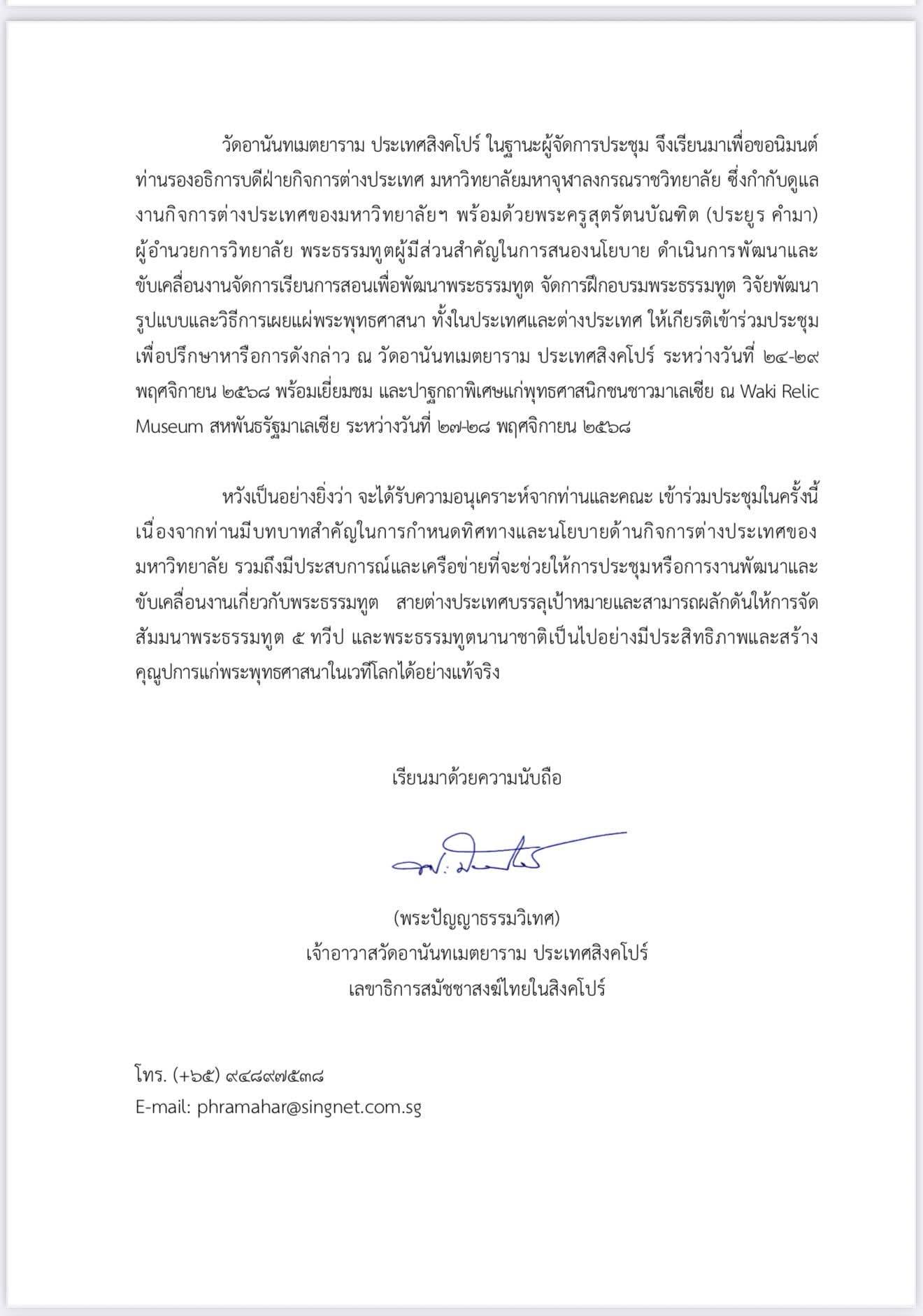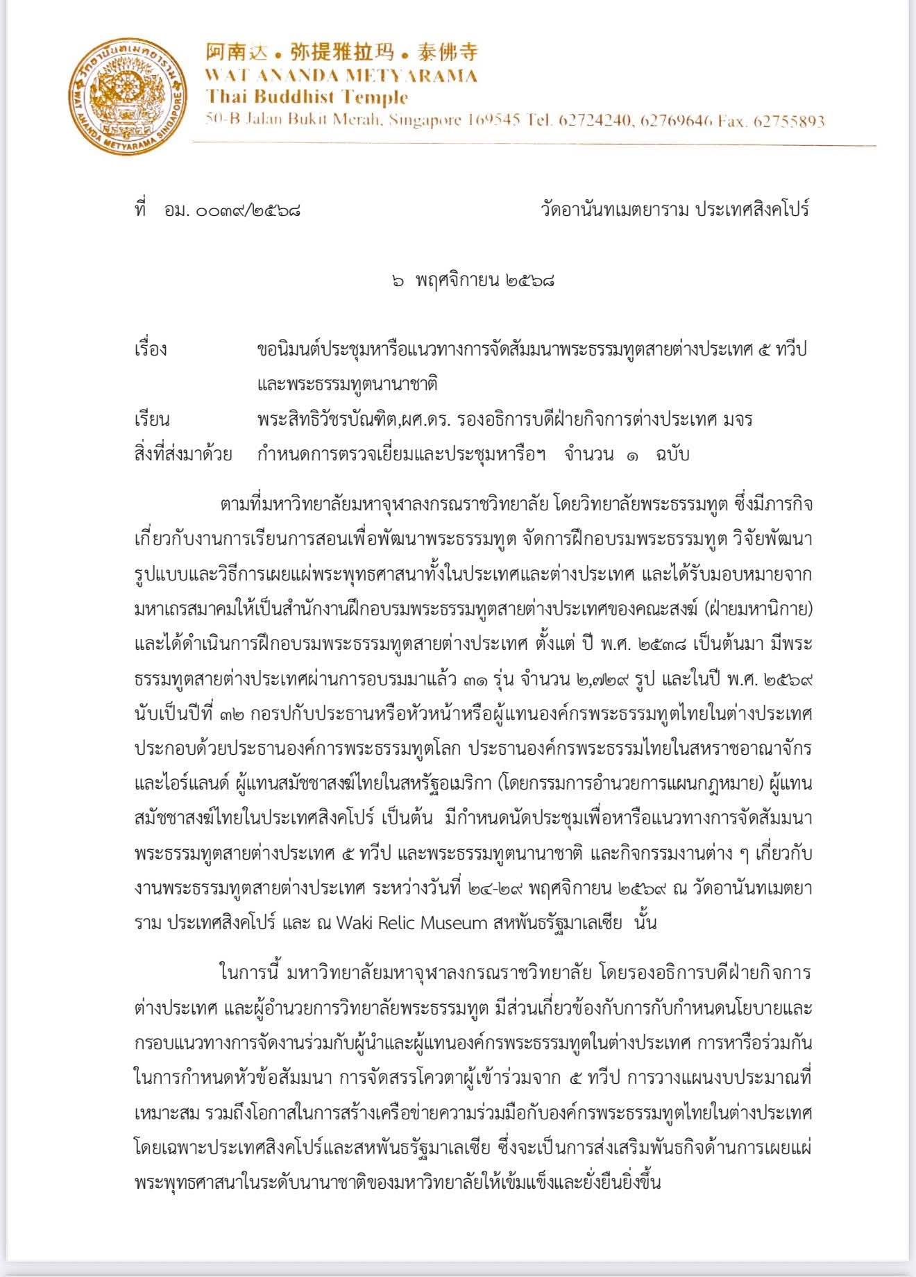 พระปัญญาธรรมวิเทศ เจ้าอาวาสวัดอานันทเมตยาราม เลขาธิการสมัชชาสงฆ์ไทยในสาธารณรัฐสิงคโปร์ อาราธนา พระสิทธิวัชรบัณฑิต รองอธิการบดีฝ่ายกิจการต่างประเทศ ประธานคณะกรรมการดำเนินงานโครงการอบรมพระธรรมทูตสายต่างประเทศ มจร และ พระครูสุตรัตนบัณฑิต ผู้อำนวยการวิทยาลัยพระธรรมทูต เลขานุการคณะกรรมการดำเนินงานโครงการอบรมพระธรรมทูตสายต่างประเทศ เดินทางไปปฏิบัติศาสนกิจ ณ สาธารณรัฐสิงคโปร์ และ สหพันธรัฐมาเลเซีย ระหว่างวันที่ ๒๖-๒๘ พฤศจิกายน ๒๕๖๘