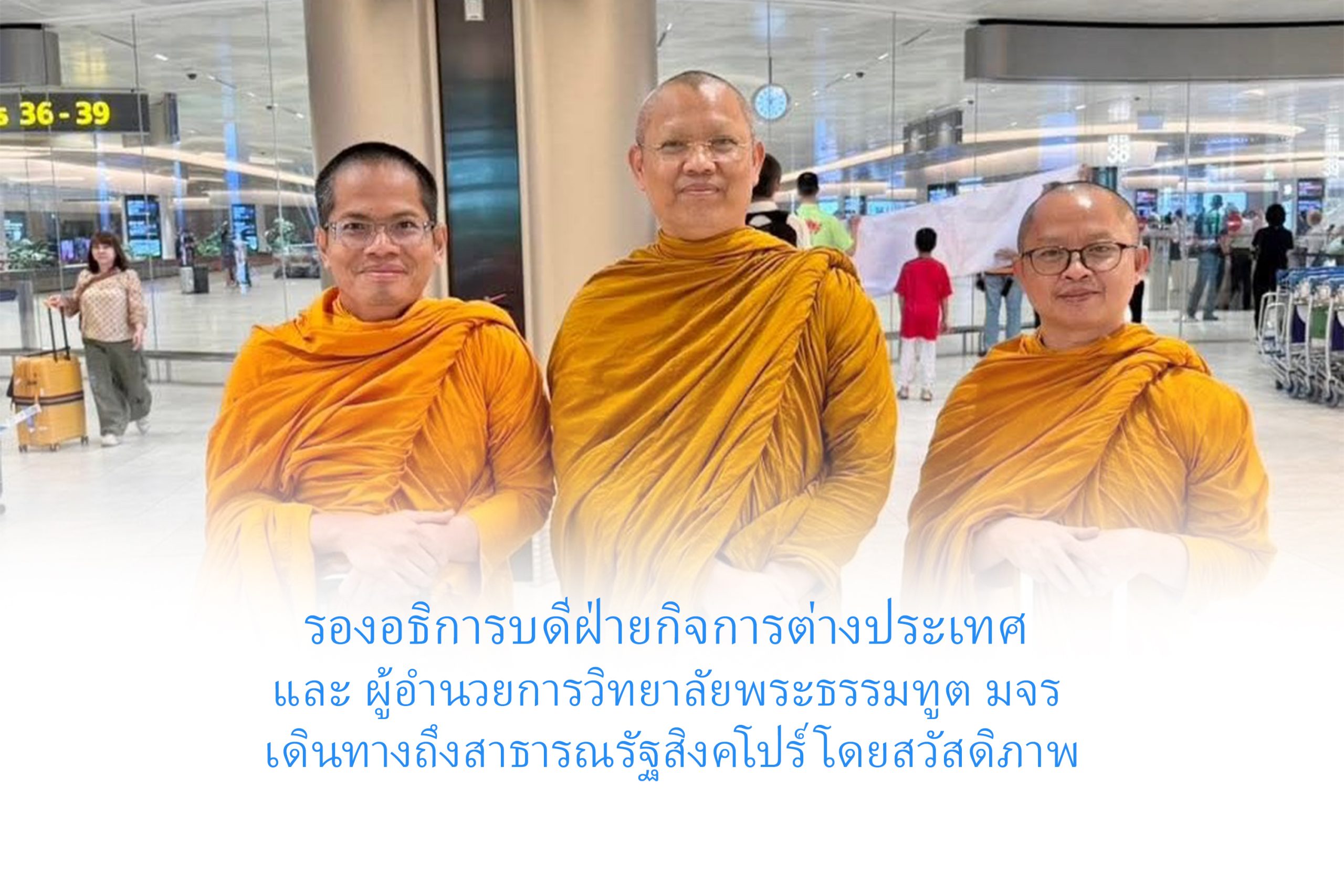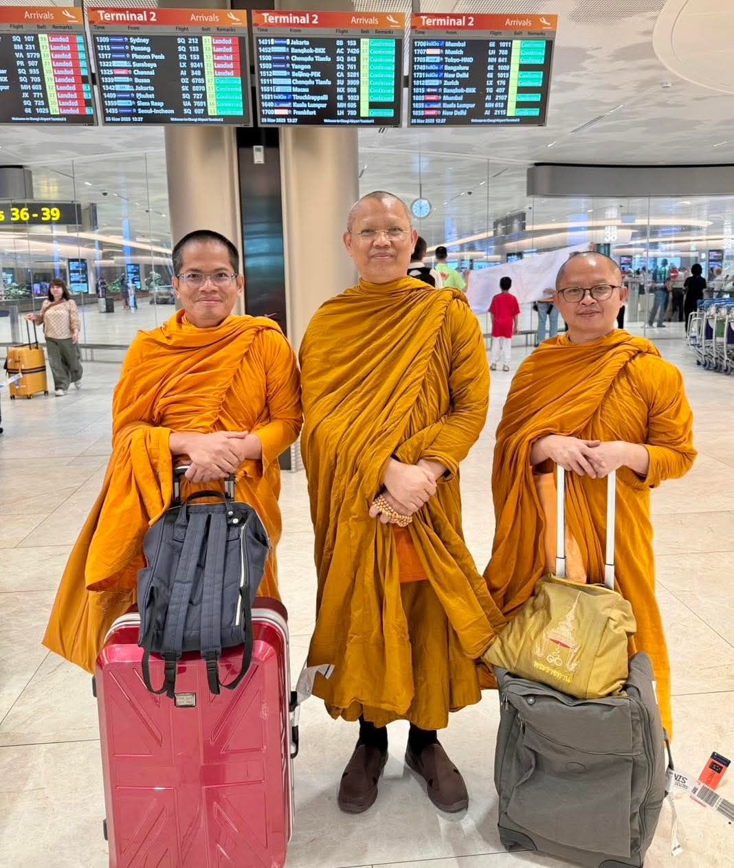 วันพุธที่ ๒๖ พฤศจิกายน พ.ศ.๒๕๖๘ เวลา ๑๓.๑๕ น. พระสิทธิวัชรบัณฑิต รองอธิการบดีฝ่ายกิจการต่างประเทศ ประธานคณะกรรมการดำเนินงานโครงการอบรมพระธรรมทูตสายต่างประเทศ มจร และ พระครูสุตรัตนบัณฑิต ผู้อำนวยการวิทยาลัยพระธรรมทูต เลขานุการคณะกรรมการดำเนินงานโครงการอบรมพระธรรมทูตสายต่างประเทศ เดินทางถึงสาธารณรัฐสิงคโปร์ โดยสวัสดิภาพ โดยมี พระมหาเดชทวี สุเมธี ป.ธ.๙ รองเจ้าอาวาสวัดอานันทเมตยาราม พระธรรมทูตสายต่างประเทศ รุ่นที่ ๙ ประจำสาธารณรัฐสิงคโปร์ ในนาม พระปัญญาธรรมวิเทศ จ้าอาวาสวัดอานันทเมตยาราม เลขาธิการสมัชชาสงฆ์ไทยในสาธารณรัฐสิงคโปร์ ถวายการปฏิสันถาร ณ ท่าอากาศยานนานาชาติชางงี