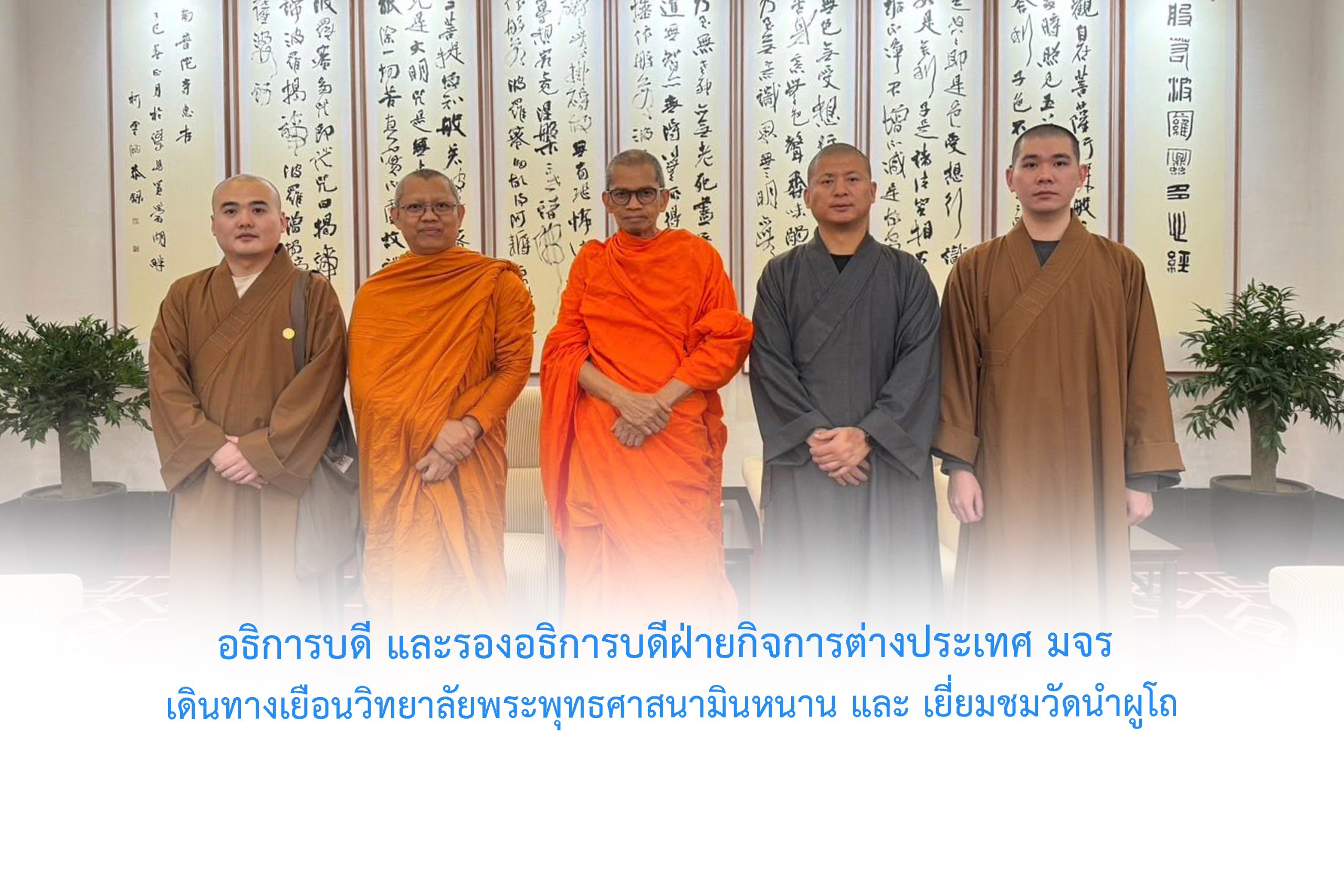 วันพฤหัสบดีที่ ๑๘ ธันวาคม พ.ศ.๒๕๖๘ เวลา ๑๐.๓๐ น. พระพรหมวัชรธีราจารย์ อธิการบดี และ พระสิทธิวัชรบัณฑิต รองอธิการบดีฝ่ายกิจการต่างประเทศ มจร เดินทางดินทางเยือนวิทยาลัยพระพุทธศาสนามินหนาน และ เยี่ยมชมวัดนำผูโถ โดยมี พระธรรมาจารย์ฉางหยวน ศิษย์เก่า มจร ในนาม Most Ven. Ze Wu, Vice President of Buddhist association of China, and Vice President of Buddhist Association of Fujian province. The Abbot of Nanputuo temple, Xiamen.The Rector of Minnan Buddhist College, Fujian province, China ถวายการปฏิสันถาร อย่างอบอุ่นและสมเกียรติ