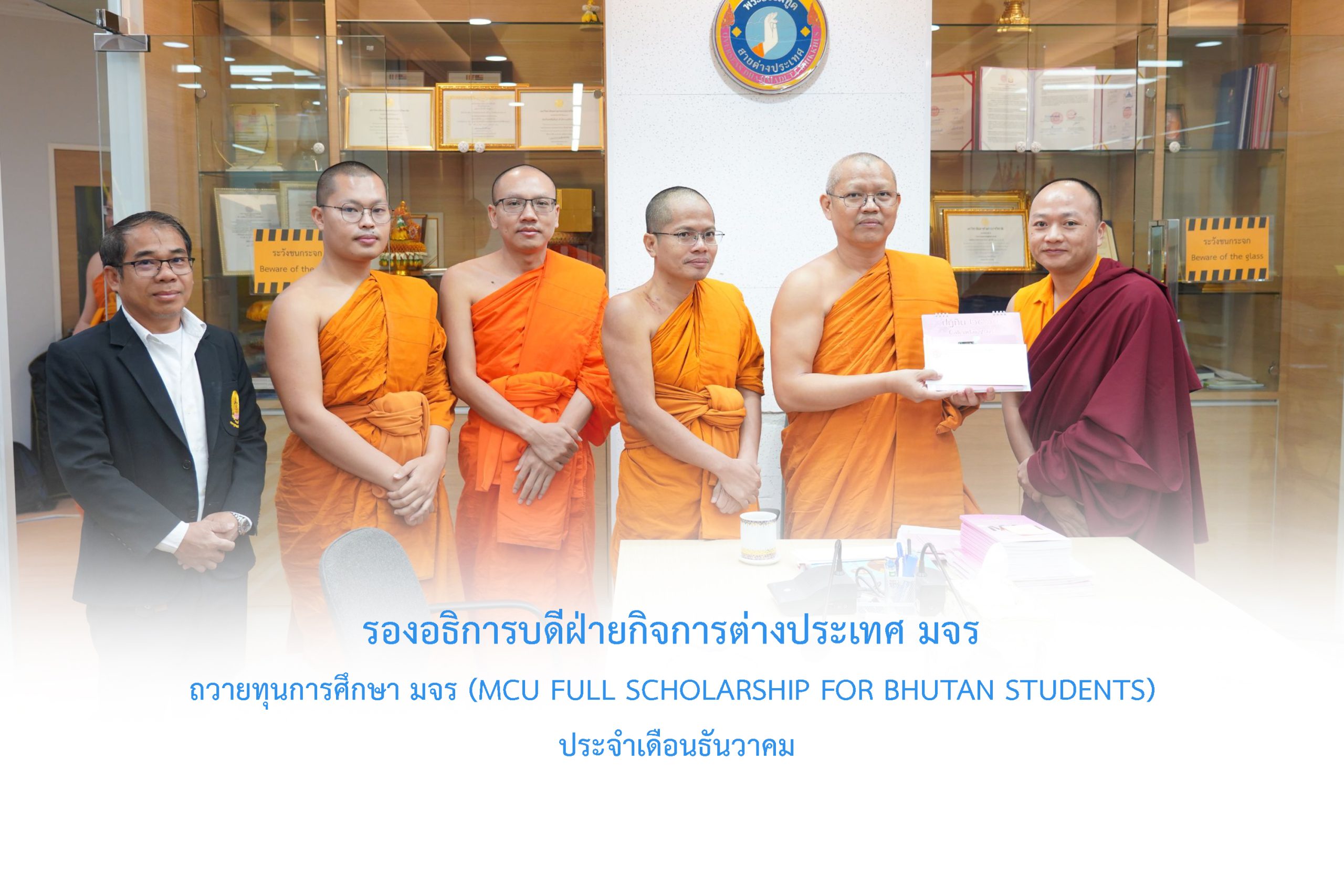 วันศุกร์ที่ ๙ มกราคม พ.ศ.๒๕๖๙ เวลา ๐๙.๐๐ น. พระสิทธิวัชรบัณฑิต รองอธิการบดีฝ่ายกิจการต่างประเทศ ประธานคณะกรรมการอุปถัมภ์ทุนการศึกษาแก่นิสิตพระสงฆ์ภูฏาน มจร ๓ รูป ได้ถวายทุนการศึกษาค่าใช้จ่ายประจำเดือน (monthly expenses) แก่นิสิตภูฏาน มจร ๓ รูป ได้แก่ (1) Venerable Thinley Wangdi (Ph.D. scholar) 2) Venerable Pema Thinley(M.A.Student) (3) Venerable Tshering Wangchuk (B.A.Student) พระสงฆ์ภูฏานทั้ง ๓ รูป นี้ ได้รับทุนการศึกษาจาก มจร ตลอดหลักสูตร (MCU Full Scholarship for Bhutan Students) ณ ห้องประชุมวิทยาลัยพระธรรมทูตและกองวิเทศสัมพันธ์ มจร พระนครศรีอยุธยา