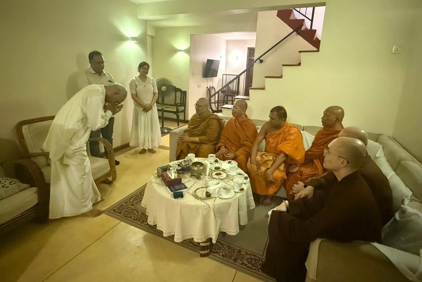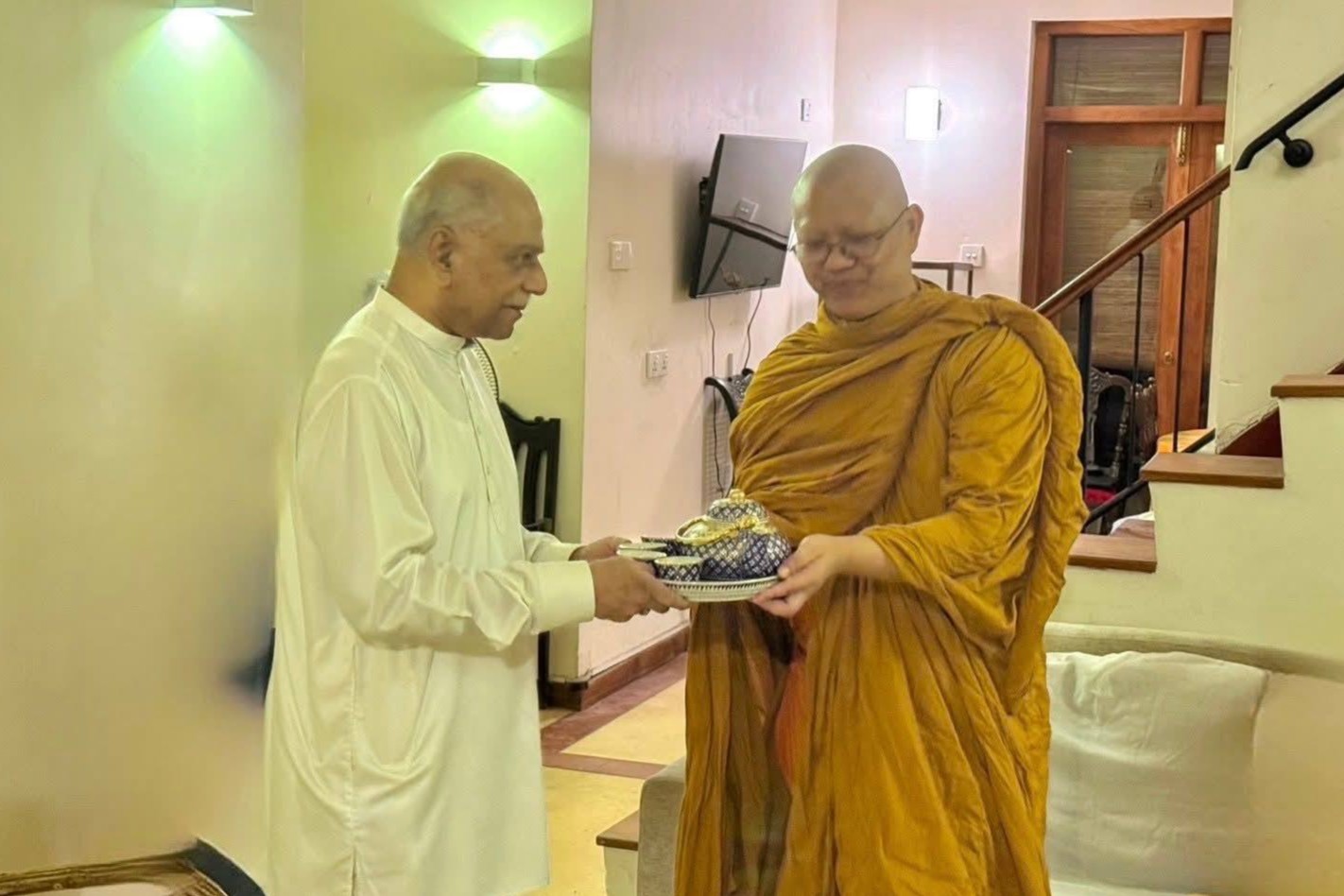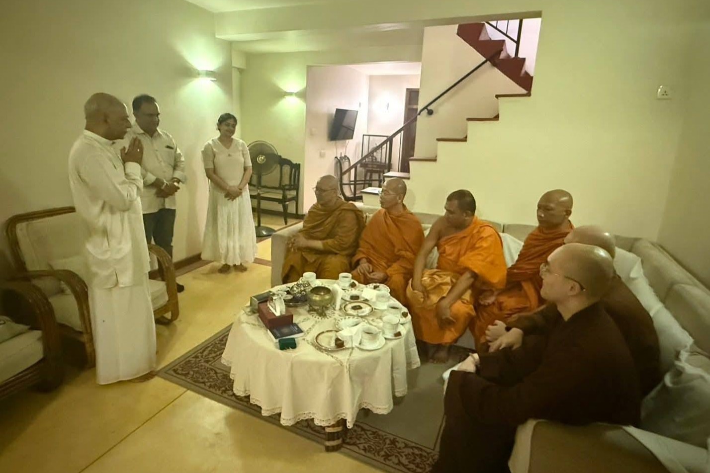 โอกาสนี้ ฯพณฯ อดีตนายกรัฐมนตรีศรีลังกา ได้น้อมถวายน้ำชาแก่รองอธิการบดีฝ่ายกิจการต่างประเทศ และคณะ พร้อมกับปรารภเรื่องความสัมพันธ์ด้านพระพุทธศาสนา สมณทูต ระหว่างคณะสงฆ์ศรีลังกา คณะสงฆ์ไทยและมหาวิทยาลัยมหาจุฬาลงกรณราชวิทยาลัย และกล่าวขอบคุณรองอธิการบดีฝ่ายกิจการต่างประเทศ ที่เดินทางมาเยี่ยม ณ บ้านพักรับรอง ทั้งยังปรารภว่า หากมีโอกาสจะเดินทางไปนมัสการรองอธิการบดีฝ่ายกิจการต่างประเทศ ณ วัดราชสิทธารามราชวรวิหาร และ มจร