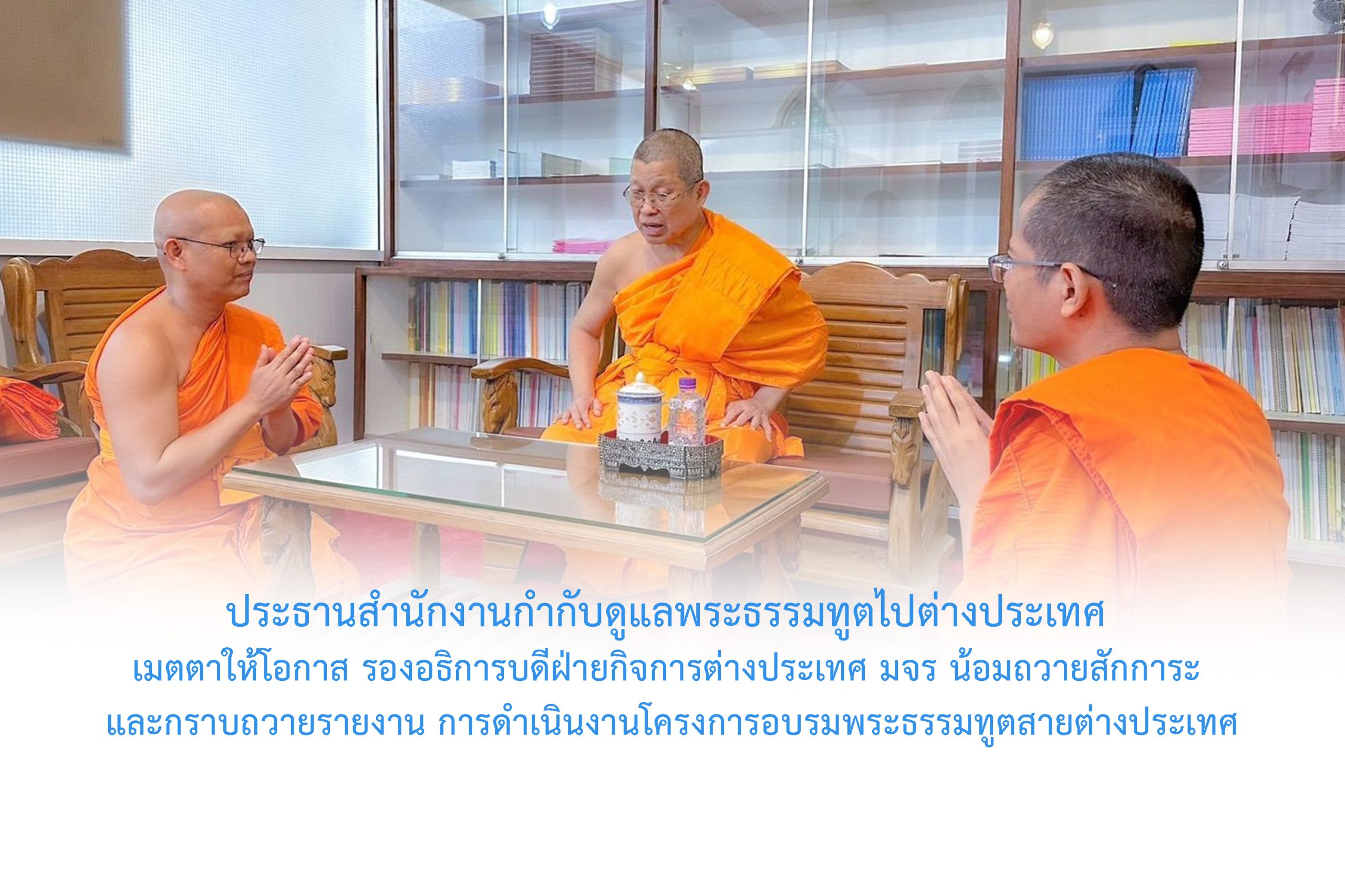 วันอาทิตย์ที่ ๑๕ กุมภาพันธ์ พ.ศ.๒๕๖๙ เวลา ๑๘.๑๐ น. พระเดชพระคุณพระพรหมโมลี กรรมการมหาเถรสมาคม ประธานสำนักงานกำกับดูแลพระธรรมทูตไปต่างประเทศ เจ้าอาวาสวัดปากน้ำ ภาษีเจริญ กรุงเทพมหานคร เมตตาให้โอกาส พระสิทธิวัชรบัณฑิต รองอธิการบดีฝ่ายกิจการต่างประเทศ ประธานคณะกรรมการดำเนินงานโครงอบรมพระธรรมทูตสายต่างประเทศ มจร น้อมถวายสักการะ และ กราบถวายรายงาน การดำเนินงานโครงการอบรมพระธรรมทูตสายต่างประเทศ ณ สำนักงานกำกับดูแลพระธรรมทูตไปต่างประเทศ วัดปากน้ำ ภาษีเจริญ กรุงเทพมหานคร