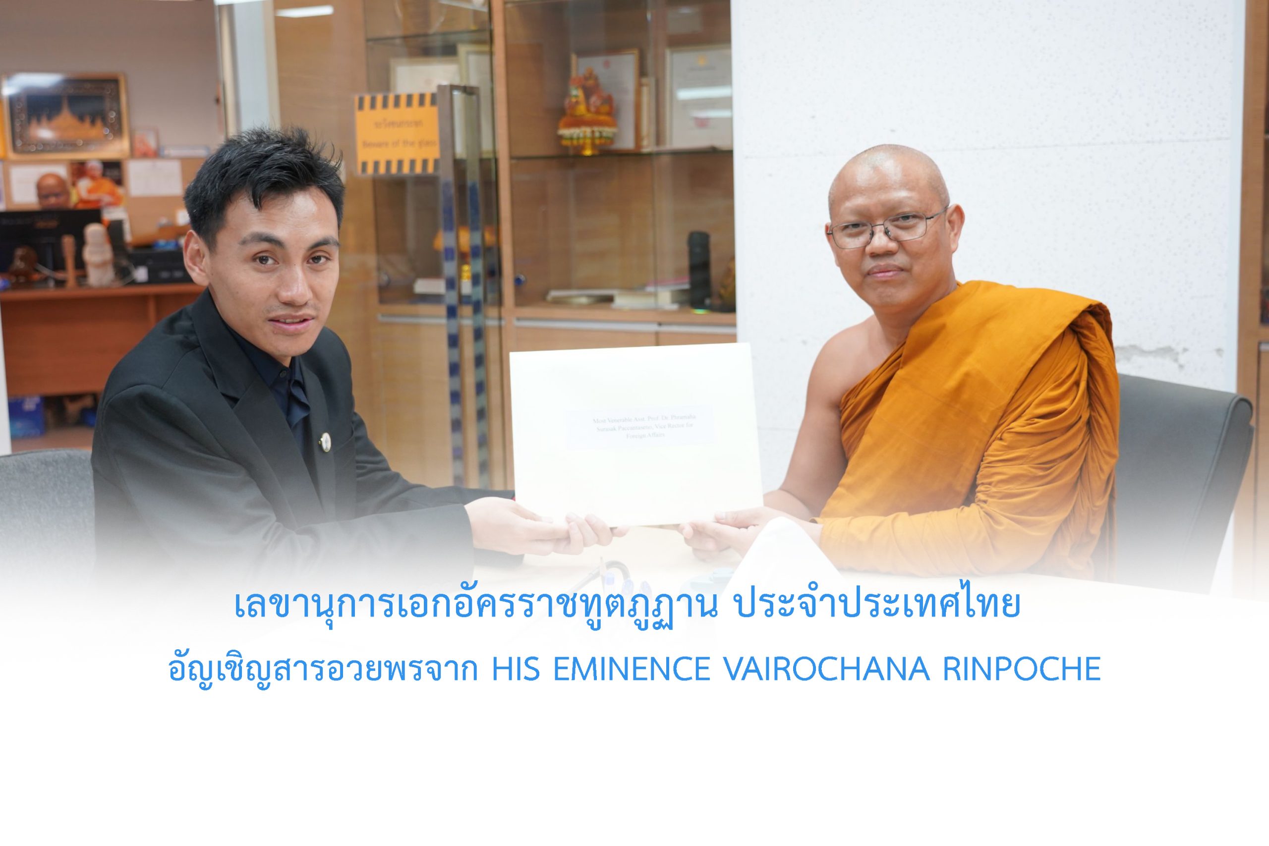 Mr. Kinley Wangyel เลขานุการเอกอัครราชทูตภูฏาน ประจำประเทศไทย อัญเชิญสารอวยพรจาก His Eminence Vairochana Rinpoche, The Kingdom of Bhutan ถวายพระสิทธิวัชรบัณฑิต รองอธิการบดีฝ่ายกิจการต่างประเทศ มจร เนื่องในมงคลดิถีอภิลักขิตสมัย ปีใหม่ ของราชอาณาจักรภูฏาน