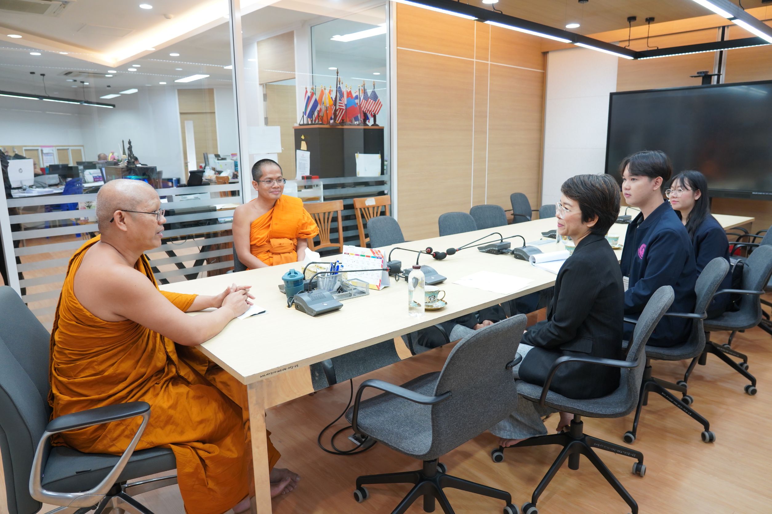 วันพุธที่ ๑๘ กุมภาพันธ์ พ.ศ.๒๕๖๙ เวลา ๑๐.๓๐ น. พระสิทธิวัชรบัณฑิต รองอธิการบดีฝ่ายกิจการต่างประเทศ และ พระครูสุตรัตนบัณฑิต ผู้อำนวยการวิทยาลัยพระธรรมทูต มจร ปฏิสันถารต้อนรับ นางสาวพิรุณพร จงไพศาล นักพัฒนาสังคมชำนาญการ หัวหน้าศูนย์ส่งเสริมและประสานการพัฒนาสังคมไทยในต่างประเทศ กองมาตรฐานการ พัฒนาสังคมและความมั่นคงของมนุษย์ กระทรวงการพัฒนาสังคมและความมั่นคงของมนุษย์ (Ministry of Social Development and Human Security – MSDHS) และข้าราชการกระทรวง พม. ณ ห้องประชุมวิทยาลัยพระธรรมทูตและกองวิเทศสัมพันธ์ มจร พระนครศรีอยุธยา