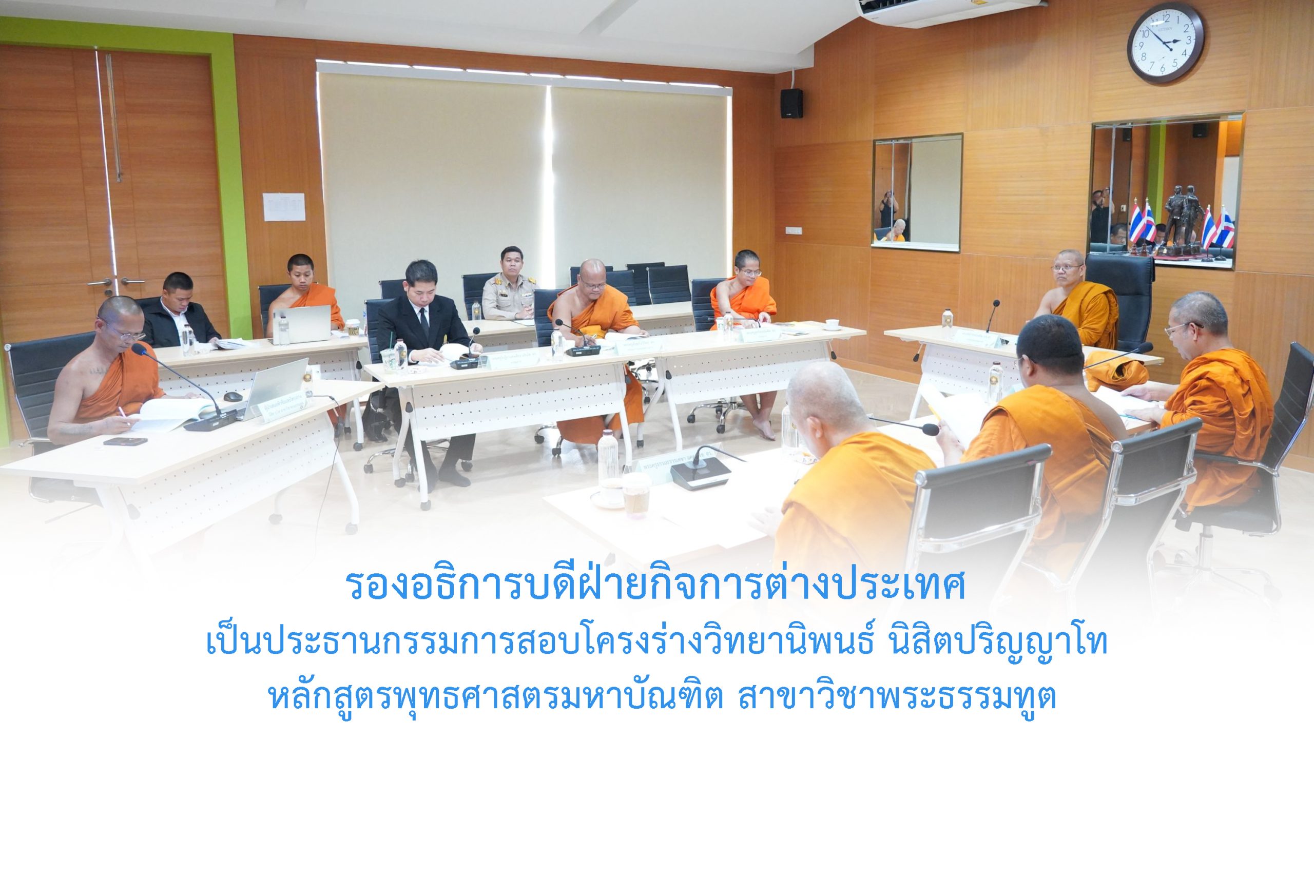 วันจันทร์ที่ ๒๓ กุมภาพันธ์ พ.ศ.๒๕๖๙ เวลา ๑๔.๓๐ น. พระสิทธิวัชรบัณฑิต รองอธิการบดีฝ่ายกิจการต่างประเทศ เป็นประธานกรรมการสอบโครงร่างวิทยานิพนธ์ นิสิตปริญญาโทหลักสูตร พุทธศาสตรมหาบัณฑิต สาขาวิชาพระธรรมทูต ณ ห้องเรียนบัณฑิตศึกษา วิทยาลัยพระธรรมทูต อาคารเรียนรวม มจร พระนครศรีอยุธยา