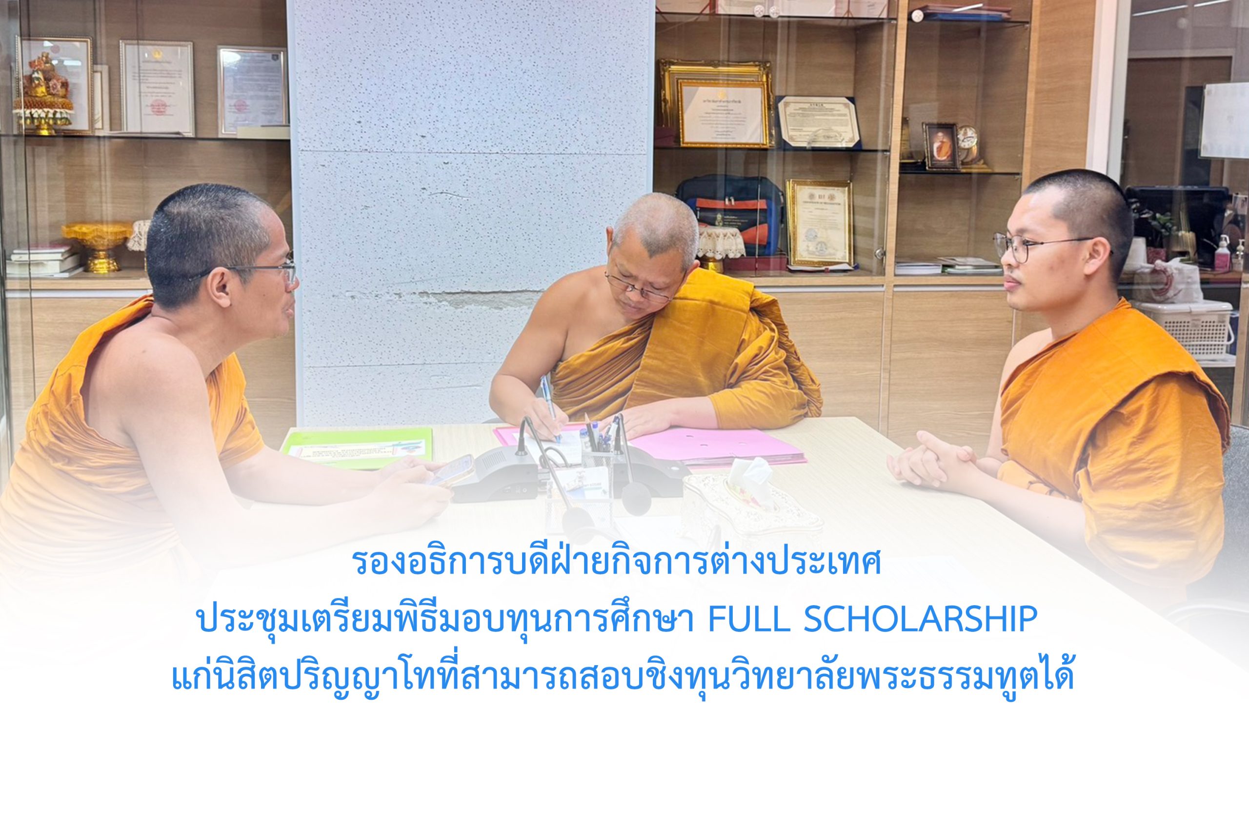 วันศุกร์ที่ ๑๓ มีนาคม พ.ศ.๒๕๖๙ เวลา ๒๑.๐๐ น. พระสิทธิวัชรบัณฑิต รองอธิการบดีฝ่ายกิจการต่างประเทศ พร้อมด้วย พระครูสุตรัตนบัณฑิต ผู้อำนวยการวิทยาลัยพระธรรมทูต และ พระมหากฤษณ กิตฺติภทฺโท ผู้อำนวยการสำนักงานวิทยาลัยพระธรรมทูต ประชุมเตรียมพิธีมอบทุนการศึกษา Full Scholarship แก่นิสิตปริญญาโทที่สามารถสอบชิงทุนวิทยาลัยพระธรรมทูตได้ ณ ห้องประชุมวิทยาลัยพระธรรมทูต มจร พระนครศรีอยุธยา