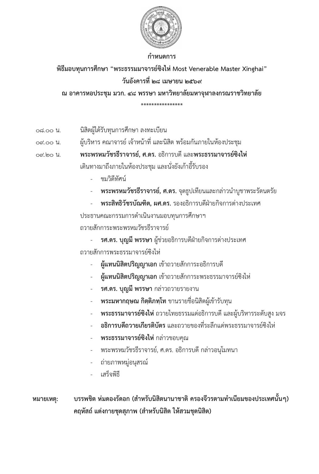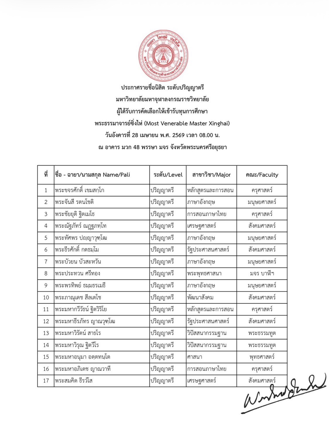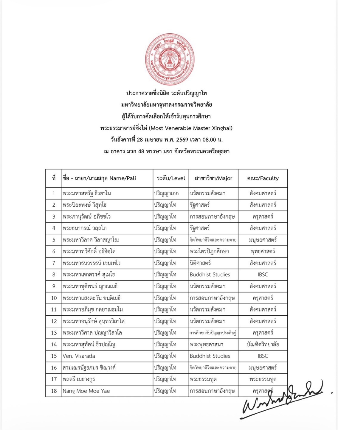 ประกาศรายชื่อนิสิต ระดับปริญญาเอก ปริญญาโท และปริญญาตรี มหาวิทยาลัยมหาจุฬาลงกรณราชวิทยาลัย ผู้ได้รับการคัดเลือกให้เข้ารับทุนการศึกษา พระธรรมาจารย์ซิ่งไห่ (Most Venerable Master Xinghai) วันอังคารที่ ๒๘ เมษายน พ.ศ. ๒๕๖๙ เวลา ๐๘.๐๐ น. ณอาคารหอประชุม มวก. ๔๘ พรรษา จังหวัดพระนครศรีอยุธยา