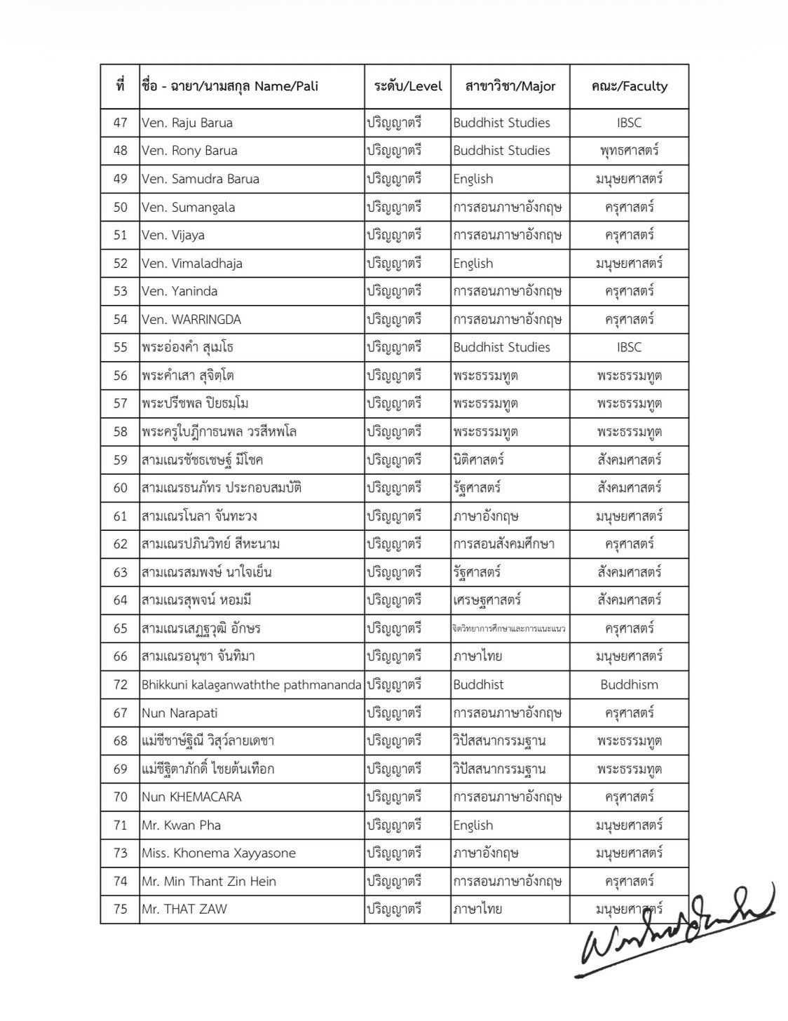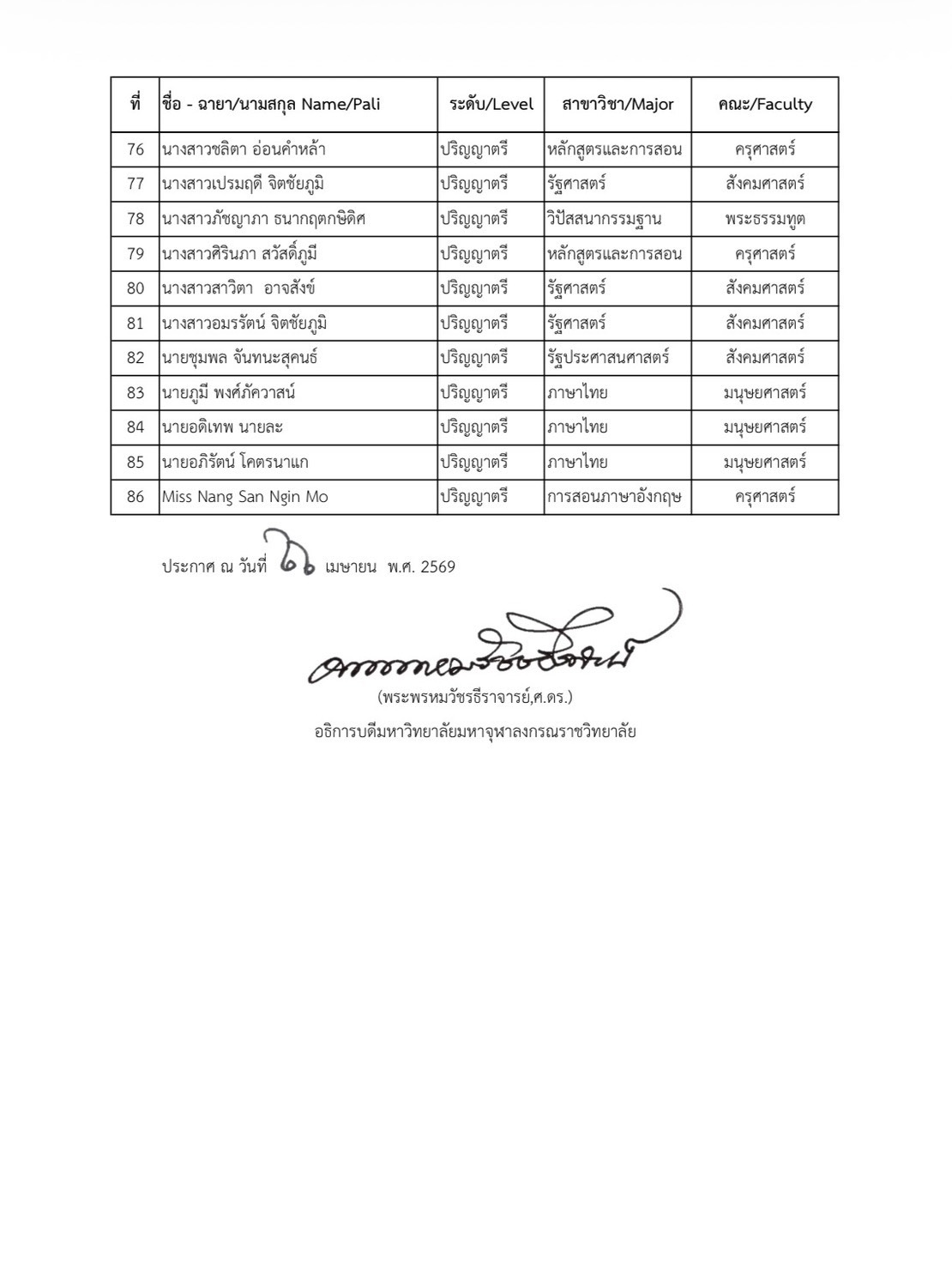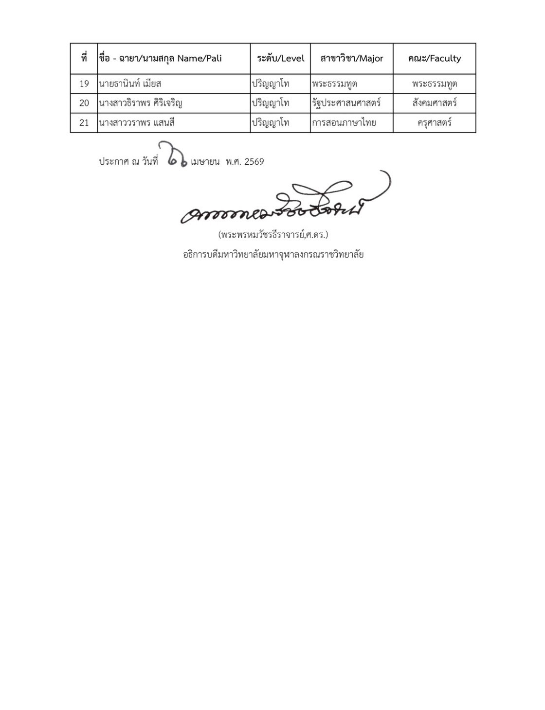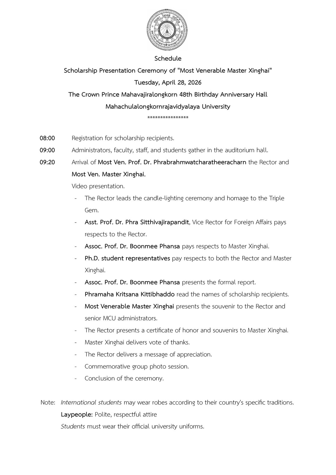 ประกาศรายชื่อนิสิต ระดับปริญญาเอก ปริญญาโท และปริญญาตรี มหาวิทยาลัยมหาจุฬาลงกรณราชวิทยาลัย ผู้ได้รับการคัดเลือกให้เข้ารับทุนการศึกษา พระธรรมาจารย์ซิ่งไห่ (Most Venerable Master Xinghai) วันอังคารที่ ๒๘ เมษายน พ.ศ. ๒๕๖๙ เวลา ๐๘.๐๐ น. ณอาคารหอประชุม มวก. ๔๘ พรรษา จังหวัดพระนครศรีอยุธยา